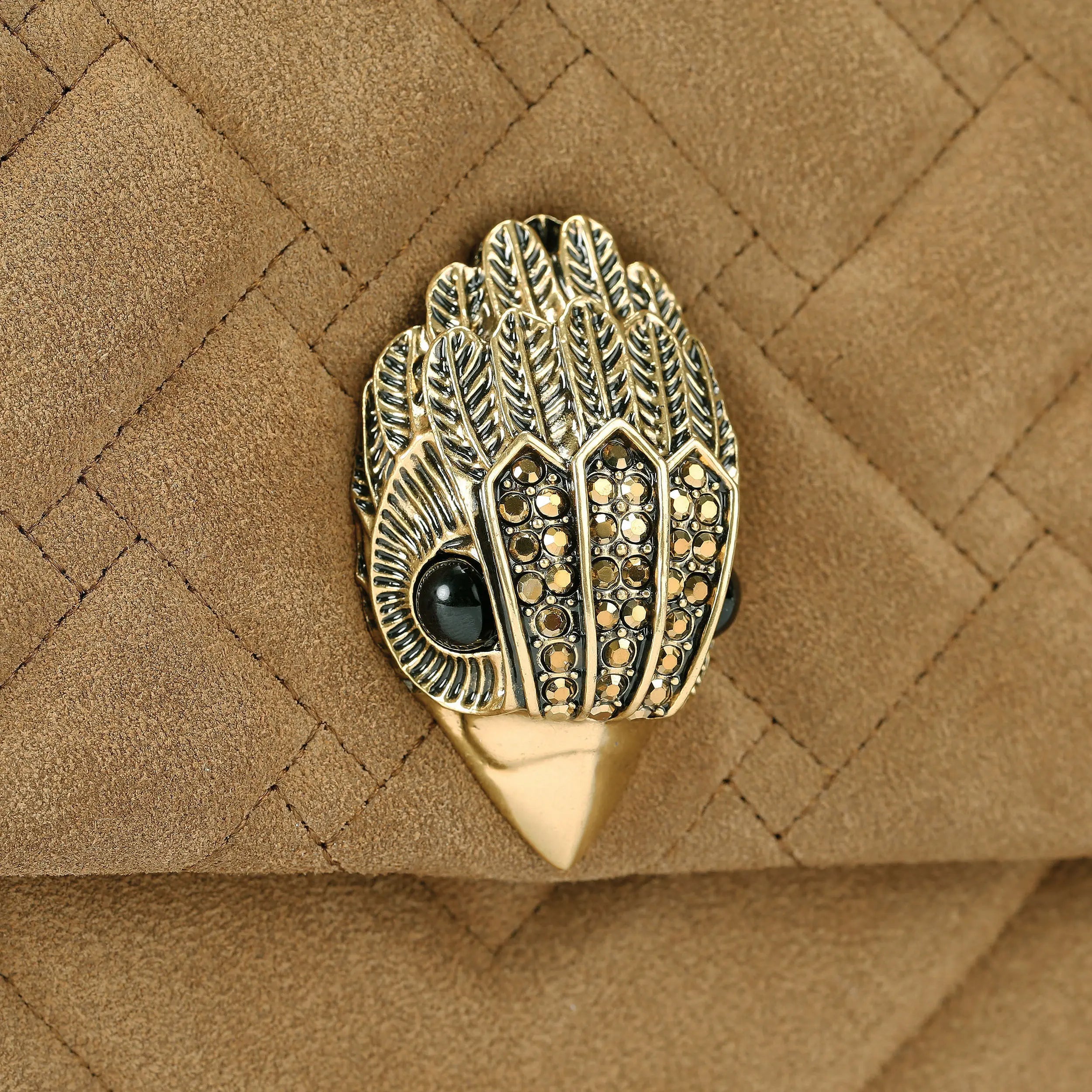 The Large Kensington Kurt is crafted from a cinnamon suede leather with overstitch quilt pattern. The large antiqued brass eagle head features crystals. The bottom of the purse features an antiqued brass 'KURT'.
