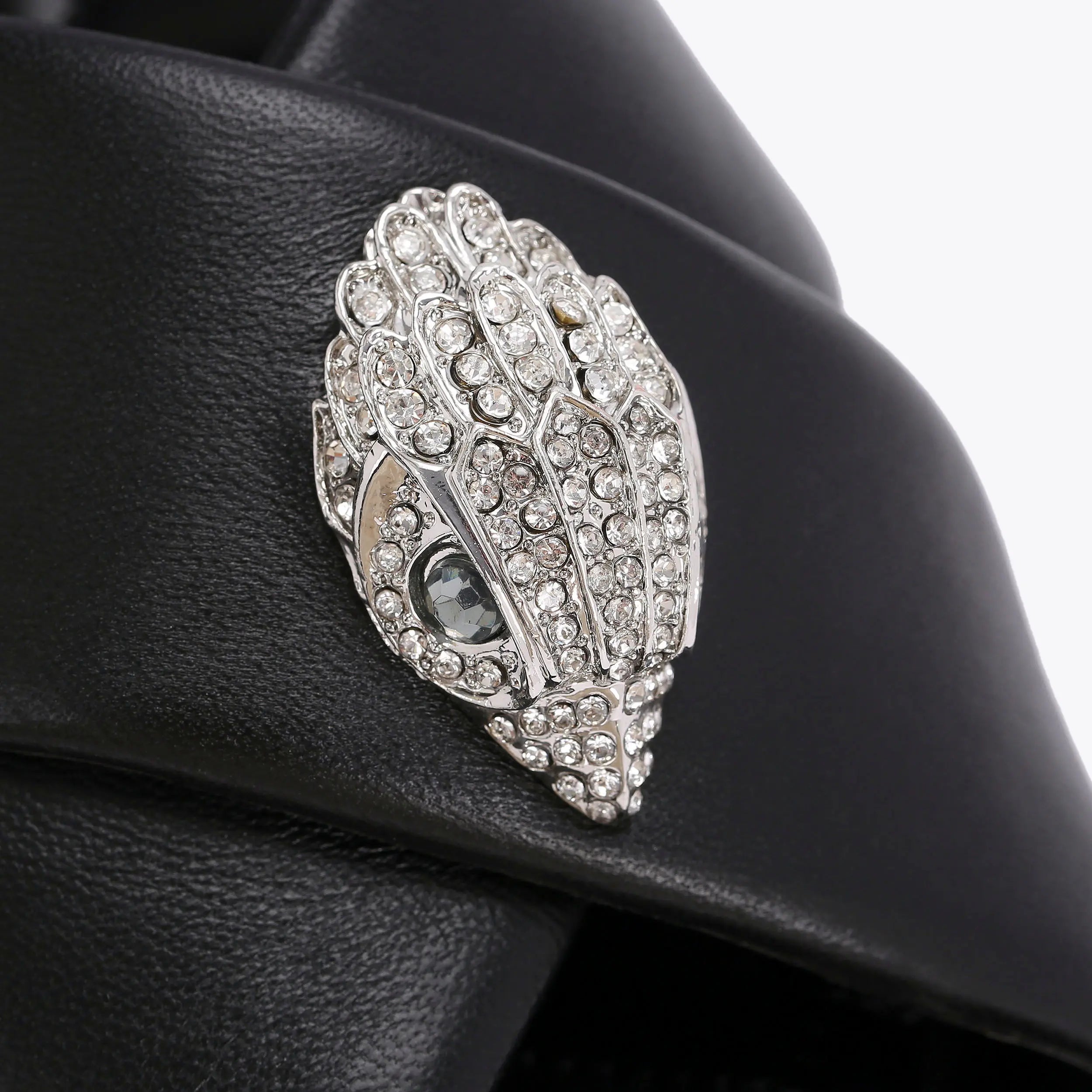 The Orson Cross Strap Sandal is crafted from a smooth black leather. There is a silver eagle head with crystals and crystal eyes on the front. The ankle strap is fastened with velcro.